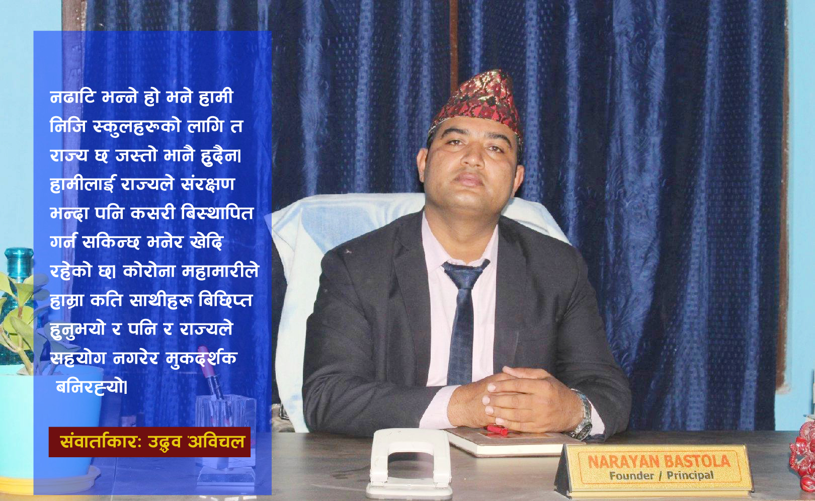 नयाँ बर्षको आगमनसंगै बिद्यालयहरु नयाँ शैक्षिक सत्रको लागि विद्यार्थी भर्ना अभियानमा व्यस्त छन्। सामुदायिक र संस्थागत विद्यालयहरुको एक किसिमको प्रतिस्पर्धा पनि देखिन्छ यो बेला। सकेसम्म निजि विद्यालयनै धेरै विद्यार्थी र अभिभावकको रोजाइमा पर्ने गरेका छन्। तर केही निजि विद्यालयले भने लुटको खेति चलाइरहेको जनगुनासो पनि सुनिदै आएको छ। यिनै समसामयिक बिषयबस्तुमा संवार्ताकार उद्धव अविचलले सनफ्लावर सेकेण्डरी बोर्डिङ स्कुलका संस्थापक/प्रिन्सिपल नारायण बास्तोलासंग गरेको कुराकानीको संपादित अंश।