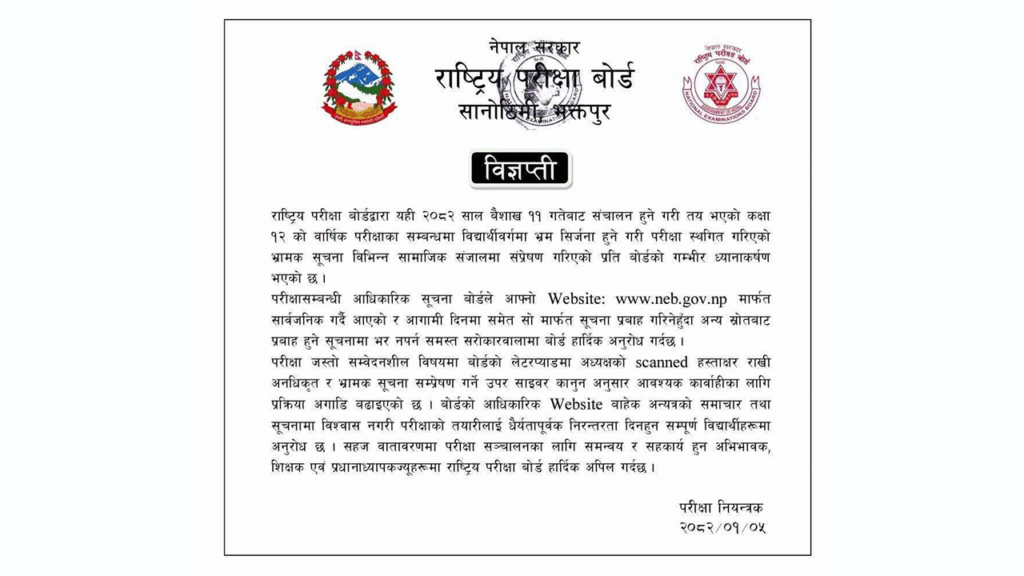 तर, बोर्डले भने परीक्षा स्थगितबारे कुनै निर्णय नगरेको प्रतिक्रिया दिएको छ । बोर्डका अध्यक्ष महाश्रम शर्माले यसबारेमा कुनै निर्णय नगरिएको प्रस्ट पारेका छन् । बोर्डले आधिकारिक सूचना समेत जारी गर्दै उक्त विषयमा ध्यानाकर्षण भएको जनाएको छ । अनधिकृत र भ्रामक सूचना सम्प्रेषण गर्ने माथि कानुनी कारबाहीको प्रक्रिया अघि बढाएको जनाउँदै बोर्डले आधिकारिक वेबसाइटमार्फत् प्रवाह हुने सूचनामा मात्रै भर पर्न आग्रह गरेको छ ।