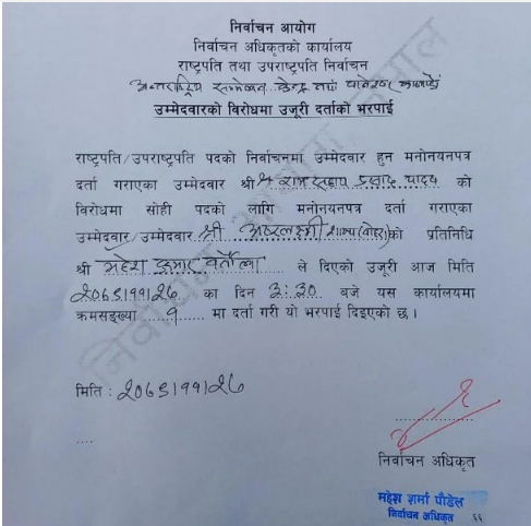 यादवविरुद्ध निर्वाचन अधिकृतको कार्यालय बानेश्वरमा एमाले उम्मेदवार अष्टलक्ष्मी शाक्यको प्रतिनिधि बनेर महेश बर्तोलाले उजुरी दर्ता गराएका हुन् ।