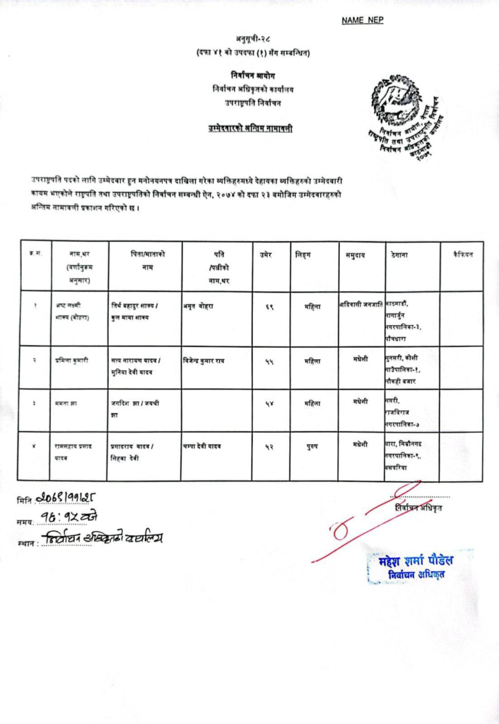 उपराष्ट्रपतिमा जसपाबाट नेतृ प्रमीला यादव र नेता राम सहायप्रसाद यादवको उम्मेदवारी परेको छ । यस्तै, नेकपा ९एमाले०बाट अष्टलक्ष्मी शाक्यले उम्मेदवारी दिएकी छन् भने जनमत पार्टीबाट ममता झाले उम्मेदवारी दर्ता गरेकी छन् ।