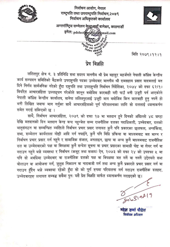 उपराष्ट्रपति निर्वाचनको प्रचारप्रसार गर्न नपाइने अवधिमा काँग्रेसले बैठकमा उपराष्ट्रपतिका उम्मेदवार रामसहाय प्रसाद यादवलाई भोट हाल्न सांसदलाई निर्देशन गर्ने निर्णय सार्वजनिक गरेपछि कार्यालयले जवाफ मागेको हो ।