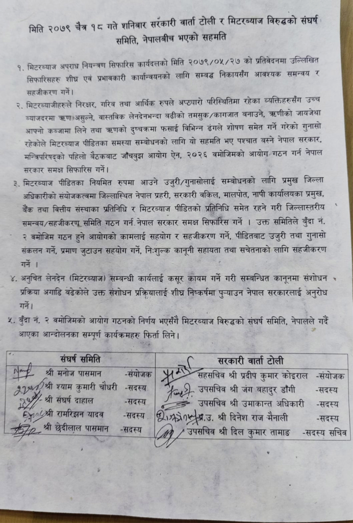 सरकारी वार्ता टोली र र पीडितहरूको वार्ता टोलीबीच मिटरब्याज पीडितको समस्या समाधानका लागि आयोग गठन गर्नेसहितका ५ बुँदे सहमति भएको छ ।