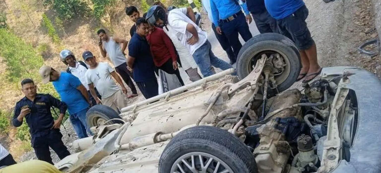 आज दिउँसो उपल्लो घुम्तीबाट कार अर्काे घुम्तीमा खसेको थियो । गाडीमै च्यापिएका सबैलाई डोजरको प्रयोग गरी निकालिएको थियो ।