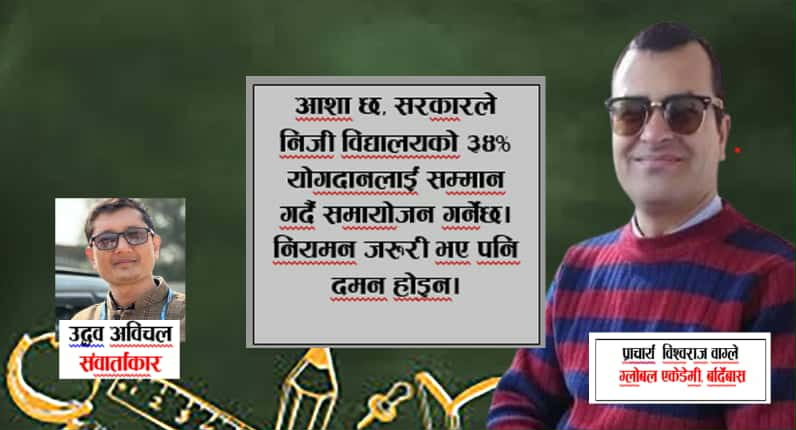 विगत लामो समयदेखि शैक्षिक क्षेत्रमै समर्पित वाग्लेले बर्दिबासको शैक्षिक विकास, शिक्षा विधेयकका विवादास्पद प्रावधानहरू, निजी विद्यालयप्रतिको राज्यको दृष्टिकोण, विद्यार्थी भर्नाको प्रतिस्पर्धा, र निजी शिक्षाको भविष्यबारे आफ्ना विचार स्पष्ट रूपमा प्रस्तुत गर्नुभएको छ। यही सन्दर्भमा, विशेषगरी महोत्तरी जिल्लाको बर्दिबास क्षेत्रको शैक्षिक अवस्था र शिक्षा विधेयकप्रति अभिमत लिनका लागि ग्लोबल एकेडेमी बर्दिबासका प्राचार्य श्री विश्वराज वाग्लेसँग संवाद गर्नु भएको छ संवार्ताकार उद्धव अविचलले।