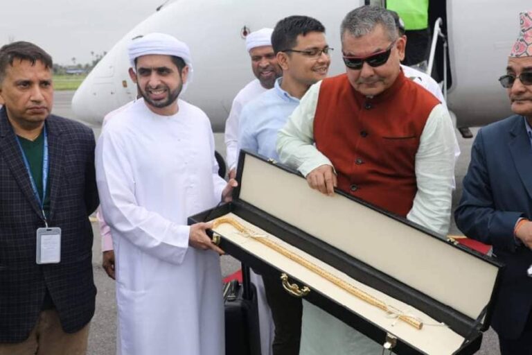 काठमाडौं । नेपाल भ्रमणमा आएका संयुक्त अरब इमिरेट्स (यूएई) का अधिराजकुमार जुमा अल मोक्तुमले नेकपा एमालेका केन्द्रीय सदस्य दुर्गा प्रसाईंलाई सुनको लौरो उपहार दिएका छन् ।