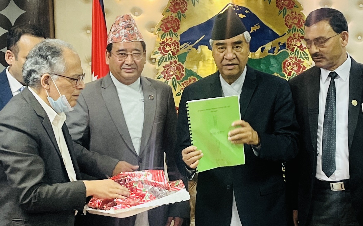 आइतबार बिहान प्रधानमन्त्री निवास बालुवाटारमा आयोजित कार्यक्रममा संस्कृति, पर्यटन तथा नागरिक उड्ययनमन्त्री जीवनराम श्रेष्ठको उपस्थितिमा विज्ञ समूहका संयोजक वीरेन्द्रबहादुर देउजाले प्रधानमन्त्री देउवालाई अध्ययन प्रतिवेदन हस्तान्तरण गरेका छन्।
