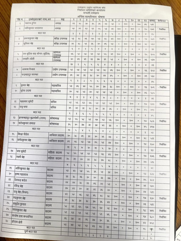 उद्योग उपाध्यक्षमा आकाश रिजाल ६५२ मत पाएर निर्वाचित हुँदा उनका प्रतिस्पर्धी चन्द्रबहादुर मानन्धरले ५३८ मत पाएका छन् ।