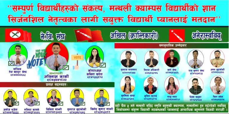 स्वतन्त्र बिद्यार्थी यूनियन मन्थलीको सहिद स्मृति वहुमुखी क्याम्पसमा नेविसंघ र अखिल क्रान्तिकारी सहितको गठबन्धन बाट अविनाश कार्कीको अध्यक्षतामा ८ सदस्यिय प्यानल बनाएर चुनावी मैदानमा होमिएका छन् ।