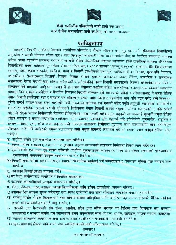 रामेछाप । चैत्र ५ गते हुन लागेको स्ववियु निर्वाचनमा तालमेल गरेर चुनावमा भाग लिएका मन्थली सहिद स्मृति बहुमुखी क्याम्पसका विद्यार्थी संगठनले घोषणा पत्र एवं प्रतिबद्धता सार्वजनिक गरेको छ ।