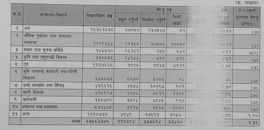 यस्तै भौतिक पूर्वाधारमा १५.६२, सञ्चारमा ४.८१, कृषिमा ४.८१ प्रतिशत बेरुजु रहेको छ । यसैगरी गृहमा २.७९, भूमि व्यवस्था, सहकारी तथा गरिबी निवारणमा २.३८, ऊर्जा, जलस्रोत तथा सिँचाइमा २.३०, सहरी विकासमा १.९५ प्रतिशत बेरुजु रहेको प्रतिवेदनले देखाएको छ ।