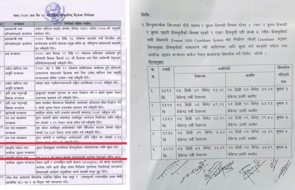 २०७५ सालबाट आरोहण खुल्ला गरिएको जुगल अन्तर्गतका अन्य हिमाल समेत खुल्ला गर्ने सरकारी निर्णयले यस क्षेत्रमा खुसी थपिएको छ । काठमाडौंबाट तीन दिनमै पुग्न सकिने नजिकको गन्तब्यका हिमाल आरोहण खुल्ला गर्ने निर्णयले सिन्धु पर्यटनमा थप टेवा पुग्ने विश्वास सम्वन्धित क्षेत्रका विज्ञहरुको छ । गत चैत २८ गते बसेको मन्त्रिपरिषद्को बैठकले जुगल हिमाल अन्तरगत ‘जुगल १’ देखि ‘जुगल ५’ नामाकरण भएका थप पाँच चुचुरा आरोहण खुल्ला गर्ने र पाँच वर्ष सम्म शुल्क नलिने निर्णय गरेको थियो ।