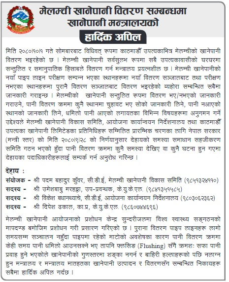 यसका लागि मन्त्रालयले चार सदस्यीय समिति गठन गरेको छ । मन्त्रालयले मेलम्चीको खानेपानी वितरण क्रममा कुनै समस्या देखिए समितिका पदाधिकारीलाई सम्पर्क गर्न अनुरोध गरेको छ ।