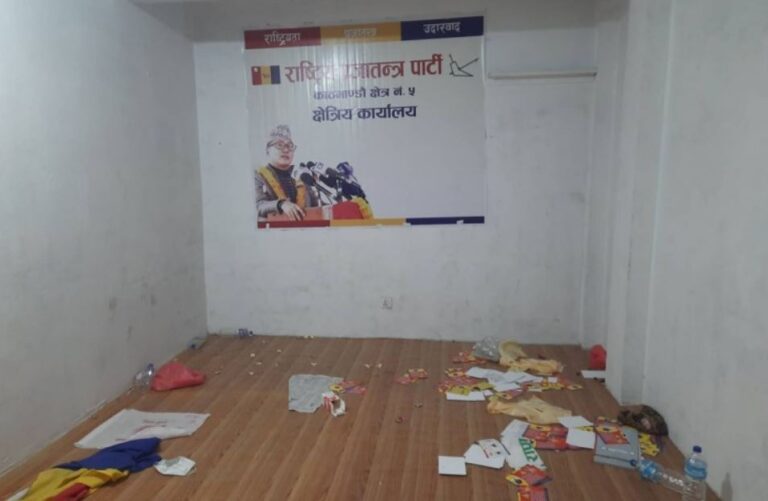 राष्ट्रिय प्रजातन्त्र पार्टी (राप्रपा) काठमाडौं निर्वाचन क्षेत्र नम्बर ५ को कार्यालयमा तोडफोड भएको छ ।