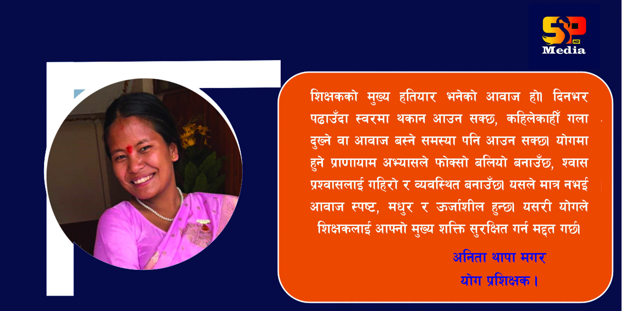 शिक्षकको मुख्य हतियार भनेको आवाज हो। दिनभर पढाउँदा स्वरमा थकान आउन सक्छ, कहिलेकाहीँ गला दुख्ने वा आवाज बस्ने समस्या पनि आउन सक्छ। योगमा हुने प्राणायाम अभ्यासले फोक्सो बलियो बनाउँछ, श्वासप्रश्वासलाई गहिरो र व्यवस्थित बनाउँछ। यसले मात्र नभई आवाज स्पष्ट, मधुर र ऊर्जाशील हुन्छ। यसरी योगले शिक्षकलाई आफ्नो मुख्य शक्ति सुरक्षित गर्न मद्दत गर्छ।